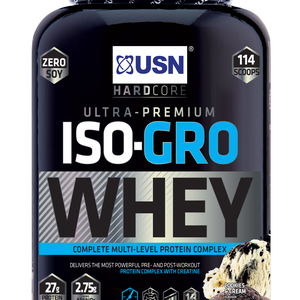 Charakteristika: IsoGro Whey je nová generace vysokoproteinového nápoje pro budování svalové hmoty díky kvalitním syrovátkovým bílkovinám. Obsahuje esenciální aminokyseliny i BCAA. Navíc obsahuje také komplex s minerály jako je zinek, hořčík, draslík, vápník a kreatinem monohydrátem. Tato směs je vhodným nápojem před tak i po tréninku. Kreatin zvyšuje fyzickou výkonnost v krátkodobých intenzivních výkonech. Vápník podporuje funkci svalů a trávicích enzymů. Zinek ovlivňuje normální metabolismus sacharidů, mastných kyselin, syntézu bílkovin a funkci imunitního systému. Hořčík přispívá ke snížení únavy a vyčerpání. Draslík ovlivňuje funkci svalů a nervového systému. ISO-Gro Whey je v dostání ve třech lahodných příchutích. Bez obsahu lepku.