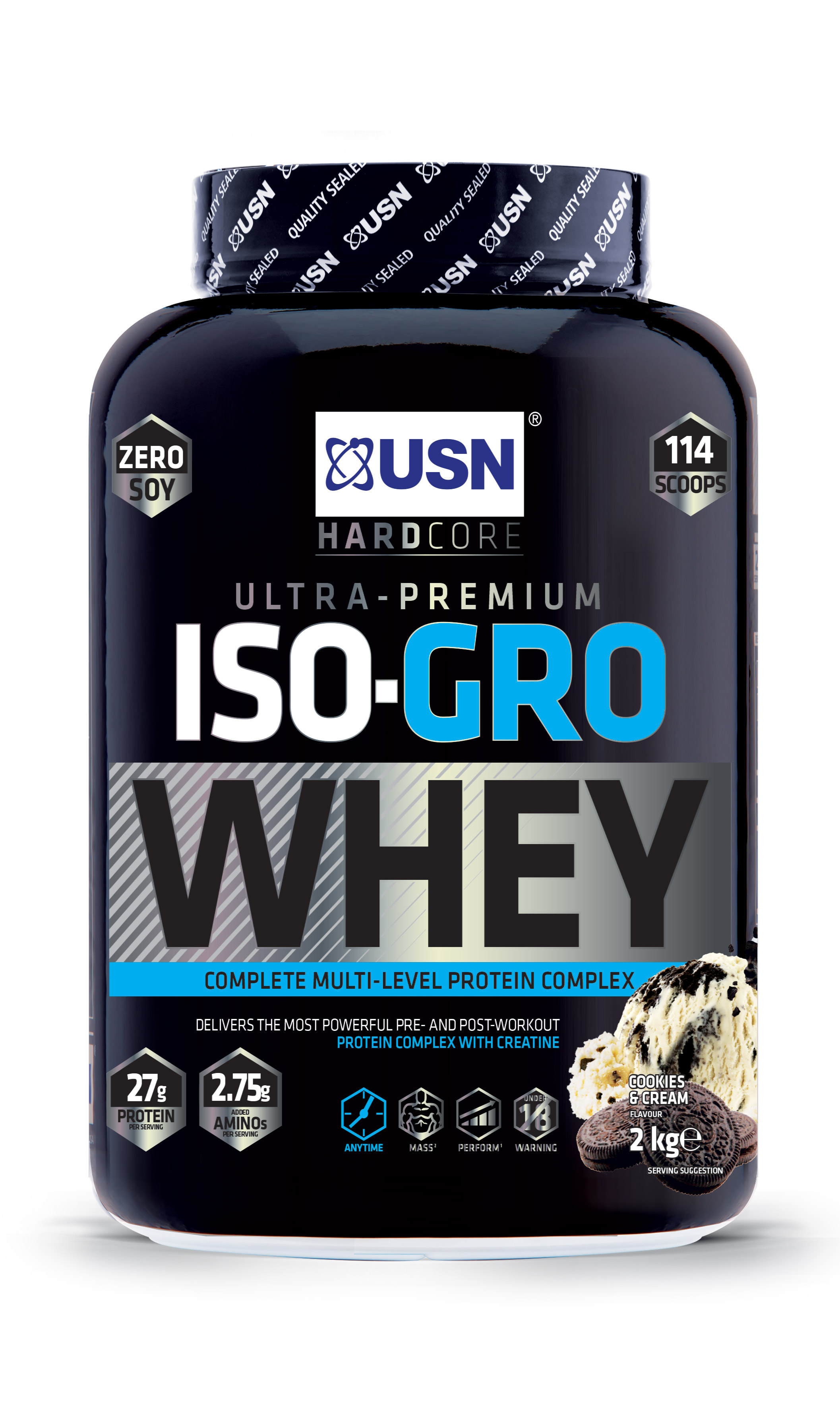 Charakteristika: IsoGro Whey je nová generace vysokoproteinového nápoje pro budování svalové hmoty díky kvalitním syrovátkovým bílkovinám. Obsahuje esenciální aminokyseliny i BCAA. Navíc obsahuje také komplex s minerály jako je zinek, hořčík, draslík, vápník a kreatinem monohydrátem. Tato směs je vhodným nápojem před tak i po tréninku. Kreatin zvyšuje fyzickou výkonnost v krátkodobých intenzivních výkonech. Vápník podporuje funkci svalů a trávicích enzymů. Zinek ovlivňuje normální metabolismus sacharidů, mastných kyselin, syntézu bílkovin a funkci imunitního systému. Hořčík přispívá ke snížení únavy a vyčerpání. Draslík ovlivňuje funkci svalů a nervového systému. ISO-Gro Whey je v dostání ve třech lahodných příchutích. Bez obsahu lepku.
